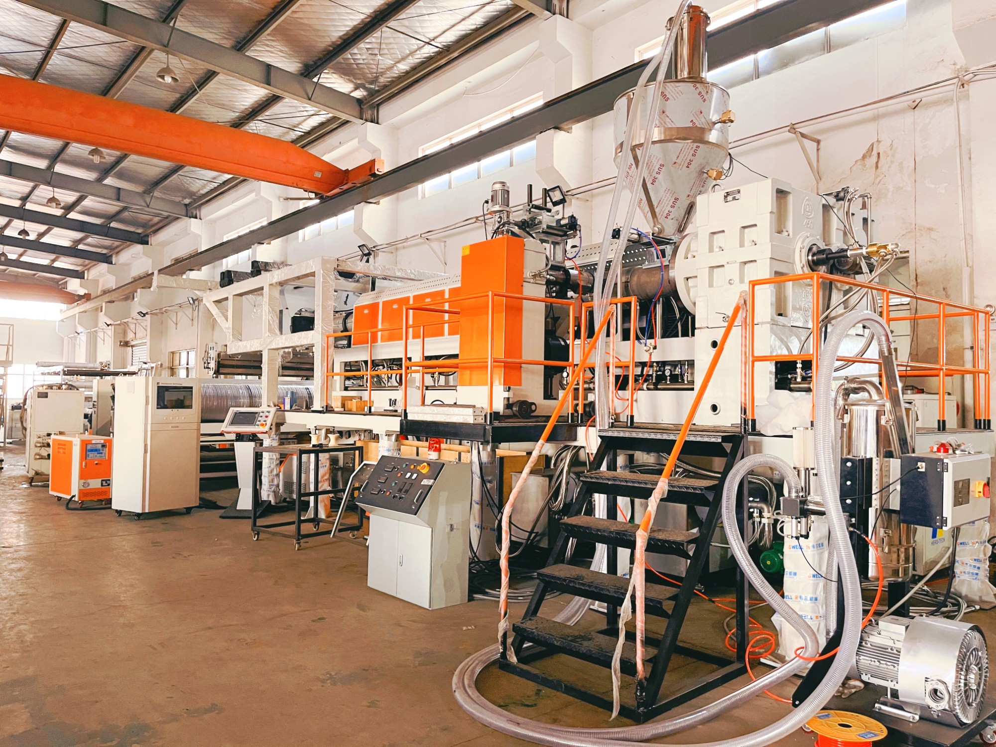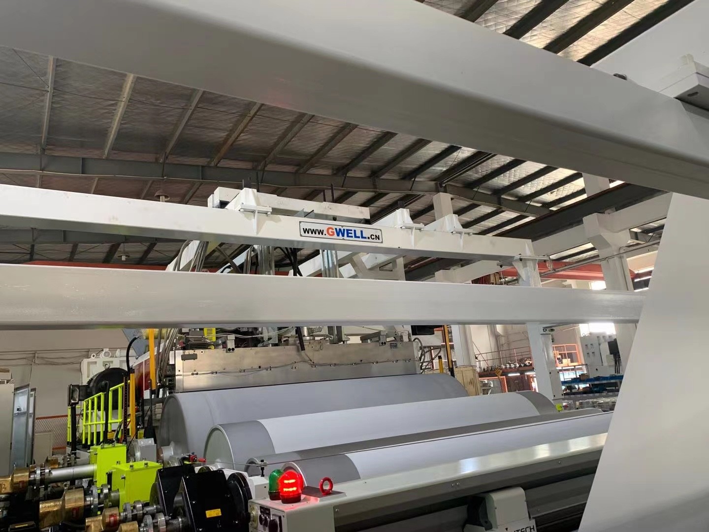 GWELL developed new type of EVA/POE/EPE solar film extrusion line, with high output, by two or three extruder co-extrusion, line speed 2x13m/min, and automatic winder,